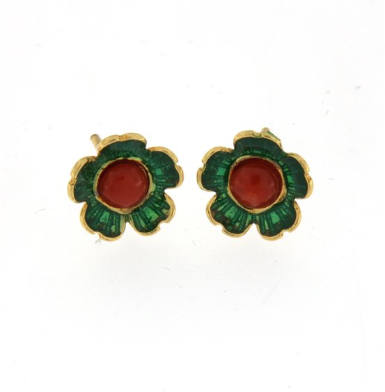 Eleganti orecchini a lobo a forma di fiore in Argento dorato 925/°°° con corallo rosso e smalto verde; diametro orecchino 10mm