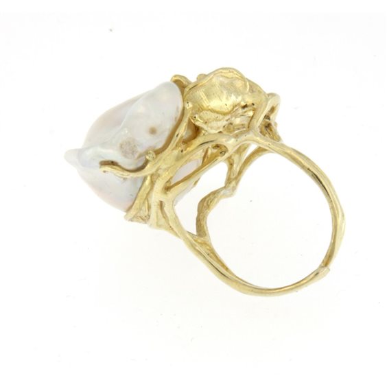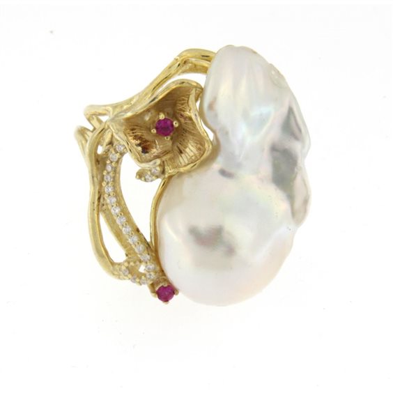 Elegante anello di fattura artigianale in Argento 925/°°° dorato con Perla Naturale Barocca e Zirconi. Misura personalizzabile su richiesta grazie al gambo aperto