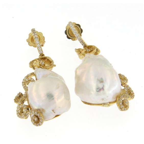 Eleganti orecchini di fattura artigianale in Argento 925/°°° dorato con Perle Naturali Barocche e Zirconi con chiusura a farfalla. Lunghezza complessiva dell'orecchino 6 cm