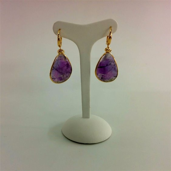 Orecchini artigianali pendenti in Argento 925/°°° con doratura 5 micron garantita e pietra naturale Ametista. Pratica chiusura a monachella; lunghezza orecchino 5cm